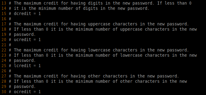 - ocredit : 암호에 최대 특수문자 개수 설정
