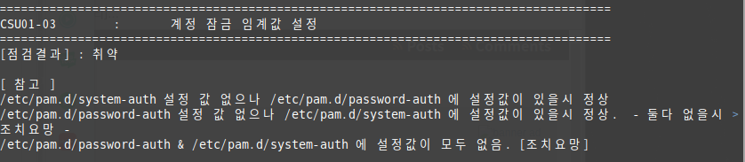 ===================================================== CSU01-04 : 패스워드 사용 기간등 login.defs ===================================================== [점검결과] : 취약