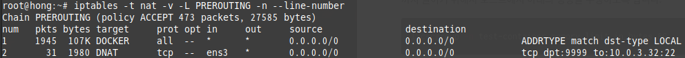 # iptables -t nat -v -L PREROUTING -n --line-number